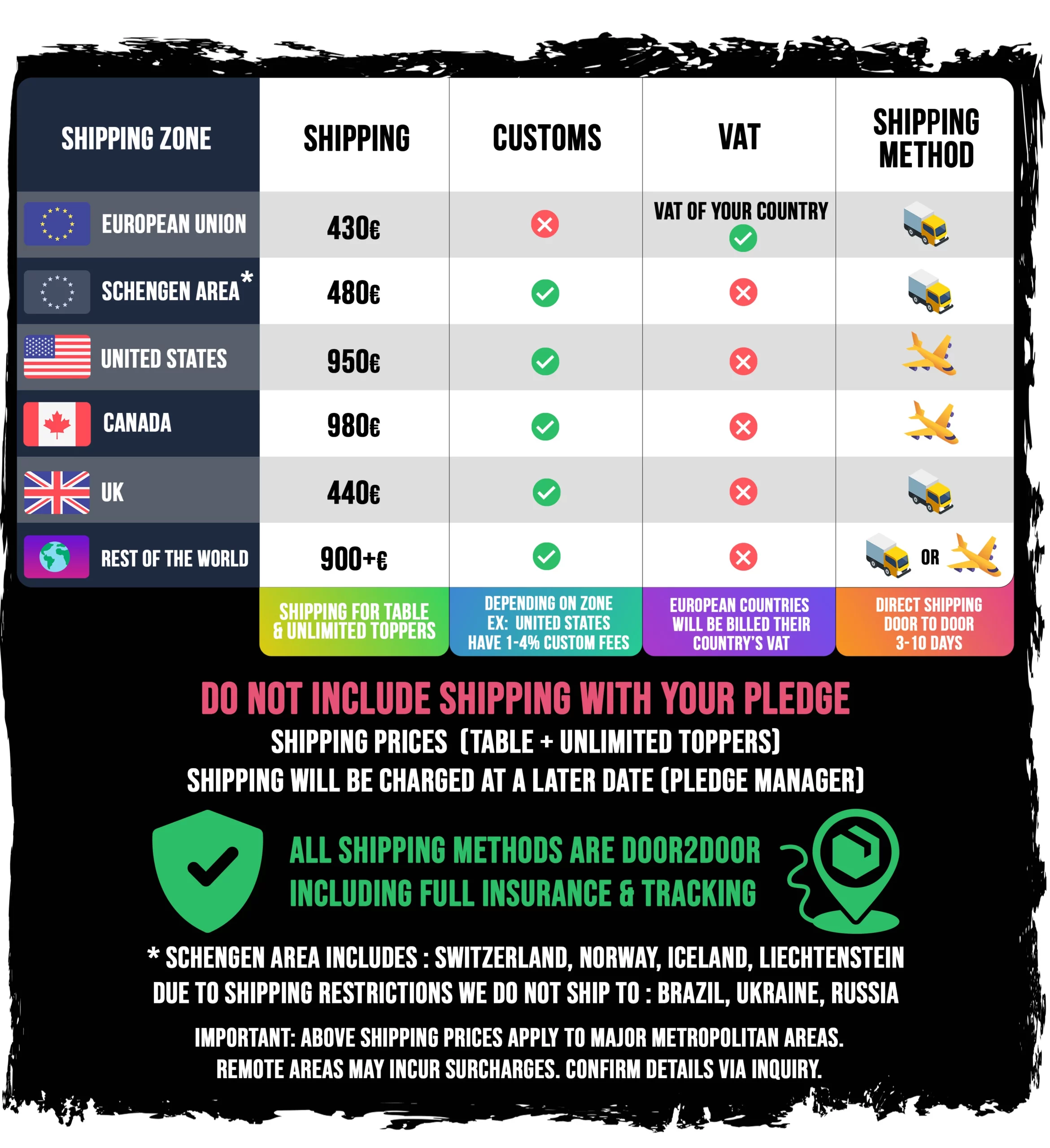 For the Sunnygeeks 2.0 Table and Unlimited Toppers (the accessories that snap into the table drawers), the shipping table is shown below.
